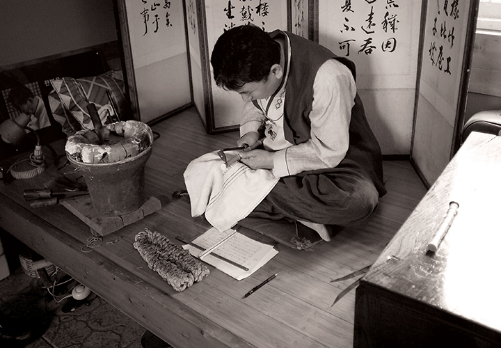 수양과 정조의 상징으로 옷자락에 고이 숨겼던 장도(粧刀). 이 지나간 유산에 낙죽으로 숨을 불어넣는 이가 있다. 한 명의 선비이자 장인, 국가무형문화재 제60호 낙죽장도장 한상봉. _국가무형문화재 제60호 낙죽장도장 한상봉선비가 만드는 유일한 공예품낙죽장도(烙竹莊刀)는 대나무로 만든 칼집이나 칼자루에 불에 달군 인두로 글을 새겨 장식한 칼이다. 삼국시대 비수(匕首)에서 유래되어 오늘날까지 이어지는 역사 깊은 우리 문화재 중 하나다. 칼이라 하면 응당 쇠를 다루는 대장장이를 떠올리기 마련이지만, 낙죽장도만큼은 선비에 의해 전승된 문화다. 구름이나 매화 등의 그림을 그리기도 하지만 기본적으로 시나 글귀를 옮겨 담았기에 한자를 아는 솜씨 좋은 문인들에 의해 제작되었다. 이를 계승한 한상봉 선생은 낙죽장도가 호신용 장신구이기도 하지만 서책으로서의 의미가 강한 애장품이라고 말한다. “불에 달군 인두로 문장을 지져서 휴대하였기에 칼이지만 하나의 책이라도 볼 수 있습니다. 많게는 수천 자의 활자를 수놓으며 문장이 가진 뜻을 마음에 새겼을 거라 생각합니다. 친한 벗에게도 선물하였다고 하니 분명 학문적 교류의 수단이 되기도 했다고 봅니다.”이후 일제강점기 열사들에 의해 항일투쟁의 의지가 새겨진 증표로 사용되던 낙죽장도는 한 집안에 의해 명맥을 유지하게 된다. _낙죽장도/30~33cm/2018 대대로 이어진 문화유산낙죽장도의 계보는 한상봉 선생의 아버지이자 국가무형문화재 고(故) 한병문 선생의 이야기로 거슬러 올라간다. 부친인 한병문 선생은 당시 서당을 운영하던 재종조부 고(故) 한기동 문하에서 글과 함께 낙죽장도의 기술을 전수받았다. 그러다 낙죽장도를 찾는 사람이 뜸해지자 부친은 농사일로 생계를 꾸려 나갔다고 한다. 그러던 중 우연한 기회에 스승의 작품이 일본 박물관에서 발견됐다는 것을 알게 됐고, 수소문 끝에 결국 자신이 마지막 전수자임을 깨닫고 다시 작품 활동을 하게 되었다고 한다. 그리고 그 뒤를 한상봉 선생이 이어가고 있다. “전승 공예는 근대산업의 발달로 뒷전으로 밀렸습니다. 그렇기에 전통 공예가는 생활이 매우 어렵습니다. 때문에 가장이 한다면 가족 모두가 반대합니다. 헌데 가업이면 생각이 다릅니다. 어렸을 때부터 함께 하고 눈여겨봤기에 전대 보유자였던 아버지가 작업을 못하게 되자 무작정 전수관에 내려와 가업을 이어받았습니다.” _고(故) 한병문 선생이 제작한 사인검/1998 인고의 시간을 버텨낸 대나무처럼대나무는 하나의 장도가 되기까지 자그마치 10여 년의 세월이 걸린다. 대나무를 12월 초부터 입춘까지 한정된 시기에만 채취, 건조로만 7~10년 정도를 보낸다. 이후에 흠결 없는 7마디 이상의 대나무를 절단하고 속을 훑어낸 후 칼집에 낙죽하기까지 또 2~3개월의 시간을 들인다. 낙죽(烙竹)이란 말 그대로 대나무에 글을 놓는다는 뜻이다. 인두의 열기를 이용, 온몸을 사용해 글과 그림을 새겨 나간다. 이 과정을 수백 수천 번 되풀이한 후 소다리뼈, 소뿔, 자개 등으로 장식하여 낙죽장도를 완성해나간다. 전 공정이 다 수작업이고 곡성에서 나는 대나무만 사용하기에 시일이 많이 걸린다. 이렇듯 전통의 맥을 잇는다는 것은 참으로 지리하고 어려운 일이다. 지극한 사명감과 책임감을 가지고 혼신의 힘을 다해야 가능하다.“저도 가끔씩 회의감이 들 때도 있지만, 해야 할 일을 하고 있다는 소명의식과 작품을 만들 때마다 느껴지는 성취감으로 버티고 있습니다. 그래서 이 길을 가는 것에 대해 후회하지 않습니다.” 13세 때부터 어깨 너머로 배운 전통 공예의 길이 벌써 수십 년, 그 중 가장 아끼는 작품은 단연 ‘경인사인검’이다. 호랑이해, 호랑이달, 호랑이날, 호랑이시에 만드는 칼을 ‘사인검’이라 한다. 그 중 백호의 해인 경인년에 제작하는 경인사인검은 60년에 딱 하루만 만들 수 있다. “제가 2010년 이 검을 완성한 이후로 많은 사람이 갖고 싶어 했습니다. 그러나 저는 개인이 아닌 국민 모두를 지켜주는 행운의 상징물이 되어야 한다고 생각했습니다. 그래서 되도록 여러분이 경인사인검을 볼 수 있도록 전수관에 전시하고 있습니다.” _경인사인검/1m10cm/2010 한국인만 모르는 한국의 보물 선대에 이어 기술과 함께 전수관을 운영 중인 한상봉 선생, 그는 자신의 아들을 수제자로 두며 다음 세대를 도모하고 있다. 이와 함께 고등학교 방과 후 과정으로 이순신장군 가검(假劍) 만들기를 지도, 전통 예술의 대중화에 힘쓰고 있다. “현실에 맞게 현대화, 산업화를 해야 한다고 생각합니다. 그래서 전통기술을 접목한 식도를 제작하려고 연구했고 현재 시제품까지 개발했습니다.” 일반인들도 부담 없이 구입할 수 있도록 현대적 의미의 낙죽장도를 구상중인 그는 그러면서도 선조들의 정신은 온전히 계승되길 바란다.“전 세계적으로 칼에 글귀를 새겨 넣는 일은 찾아보기 힘듭니다. 아랍인들이 칼에 코란 구절을 넣는 경우가 있긴 하지만, 낙죽장도처럼 수천 자의 문학작품을 새겨 넣는 일은 전무합니다. 낙죽장도는 우리나라 고유의 독창적인 문화유산입니다. 비록 대부분의 사람들은 낙죽장도의 존재조차 모르