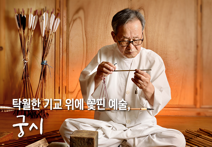 사진 제공_ 영집궁시박물관 본래 우리 민족은 활 만드는 데 탁월한 기술을 가졌다고 전해진다.삼국시대부터 궁시가 크게 발전하였고, 그중 고구려 활의 형태는 현재 사용하는 국궁과 같음을 벽화를 통해 확인할 수 있다.궁시장 유영기의 장인정신을 통해 우리 문화의 얼을 되짚어본다. 예로부터 보편화된 활쏘기_전통화살액자, 궁시장 유영기 궁시장은 활과 화살을 만드는 기능을 가진 사람을 말하며, 활을 만드는 사람을 궁장(弓匠), 화살을 만드는 사람을 시장(矢匠)이라고 한다. 고려시대에도 활쏘기는 중요했으며, 조선 전기에는 과거시험과 무과 과목에 궁술이 있었다. 그러나 임진왜란 이후부터 조총이 수입되어 활은 전쟁용 무기로서 기능을 상실하였다. 시대의 변천에 따라 많이 변화하여 현재는 국궁인 각궁이 보편화되었다.우리나라 활로는 정량궁, 예궁, 목궁, 철궁, 철태궁, 호고, 각궁 등이 있었다. 그중 현재까지 많이 쓰이는 각궁은 식물성 및 동물성 재료를 복합적으로 섞어 제작함으로써 활의 탄력성을 증가시킨 대표적인 복합궁으로 섬세한 관리를 필요로 한다. 또한 사용자의 체격과 힘에 맞춰 주문 제작하는 것이 일반적이므로 장인과 사용자 상호 간에 완벽한 이해가 필요하다.2022년 국가무형문화재로 인정된 김성락 궁시장(궁장), 김윤경 궁시장(궁장)를 비롯하여 국가무형문화재 제47호 유영기 궁시장의 뒤를 이은 유세현 전승교육사가 지난 10월 11일, 무형문화재로 인정받았다. 근현대사를 함께한 궁시장의 생애_유영기 궁시장의 작업 모습 조부 유창원부터 화살 만드는 일을 하는 유영기 궁시장은 1935년 태어났다. 조부의 고향은 경기도 개풍군이었는데 파주시 장단으로 내려와 자리를 잡았다. 당시 화살 만드는 일은 가내수공업으로 이루어져 어린 유영기를 비롯해 누이, 모친 등이 일을 도왔으며, 동네 사람들도 화살 오늬 깎는 단순한 일을 품앗이로 하기도 하였다. 하루에 화살 3개 정도를 만들었는데, 화살 10개면 쌀 한 가마니에 고기 열 근을 살 수 있을 정도로 그 값어치가 높았다.유영기 장인은 어릴 때부터 부친을 도와 화살 만드는 일을 시작하였고, 15세부터 본격적으로 전수받았다. 1968년 그의 나이 34세에 부친이 돌아가실 때까지 한국전쟁이 발발한 시대적 상황 때문에 화살 제작 공방은 장단군 노상리에서 서장리, 도라산리, 경기도 파주로 여러 차례 이동하였다.화살의 원 생명은 대나무이다. 어떤 좋은 대나무를 구하느냐에 따라 그 살의 운명이 결정된다. 유영기 궁시장은 군에 입대하기 전부터 아버지를 따라 대나무를 구하러 전국을 다녔으며 입대를 하고서도 휴가 때마다 아버지를 도왔다. 제대 후 본격적으로 가업을 잇기 시작한 그는 구례 산골 마을, 제주도, 충청도, 나치도, 대섬의 가시밭길, 이북면 최전방 등 전국의 좋은 대나무를 찾아다녔다. 국가무형문화재가 되기까지_유영기 궁시장과 아들 유세현 궁시장이 함께 깃 붙이기를 하는 모습1961년, 언론인이자 민속학자인 예용해 선생이 부친 유복삼을 찾아왔다. 당시 예용해 선생은 전국에 숨겨진 장인을 발굴해 ‘인간문화재를 찾아서’라는 기획 기사를 한국일보에 연재하고 있었는데 궁시장 중 부친 유복삼 선생이 선정된 것이었다. 그러나 유복삼은 1968년 사망하여 1971년 국가무형문화재로 지정된 궁시장 보유자로 인정받지 못하였다. 예용해 선생은 우리 전통기술에 대해 장인이 직접 기록할 것을 유영기에게 권하였고, 유영기는 <한국의 죽전>을 시작으로 이후 화살 제작 책자를 여러 권 출간하였다.1977년부터 전국 및 경기도 민예풍경진대회 10회 입상하였으며 1988년부터 본격적으로 화살 복원에 힘을 쏟아 전승공예대전에서 특별상 등 16회 수상하였다. 1992년 12월 10일 국가무형문화재 제47호 궁시장 보유자로 인정받고 나서도 화살에 대한 열정은 멈추지 않았다. 그전까지는 유엽전만 만들었지, 다른 종류의 무기 복원은 이뤄지지 않았다. 그가 궁시장 보유자가 되기 전 육군사관학교 의뢰로 전통 궁술 재현, 무기 제작 및 시연이 여러 차례 이루어졌는데, 이는 아들 유세현 장인과 함께 화살 복원에 참여하게 된 중요한 기점이 된다. 국립고궁박물관의 전신인 궁중유물전시관, 단국대박물관 등의 유물을 보고 참고하여 신기전, 효시, 박두, 편전, 통아, 장전, 주살, 유엽전, 신전, 영전 등을 복원하였으며, 현재 파주 영집궁시박물관에 소장되어 있다._아버지 유영기의 뒤를 이어 국가무형문화재로 지정된 유세현 궁시장 하나의 화살이 탄생하기까지화살의 종류로는 나무로 만든 화살촉을 사용하는 박두, 철로 만든 화살촉을 사용하는 철전, 화살의 크기가 작아 애기살로도 부르는 편전, 그 밖에도 대우전, 장군전, 세전, 유엽전 등이 있다. 조선 후기부터 유엽전이 크게 대두하였는데, 철로 만들어진 화살촉의 모양이 마치 버드나무의 잎과 같다고 하여 유엽전이라고 한다. 현재까지 가장 일반적으로 사용되는 죽시가 유엽전의 형태를 하고 있다. 활 만드는 재료는 대나무, 뽕나무, 물소뿔, 소의 심줄 등이 있다. 화살 제작의 경우 대나무, 싸리나무, 철, 심줄, 새의 깃(꿩 깃), 도피, 아교 등을 주재료로 사용한다.화살 1개를 만드