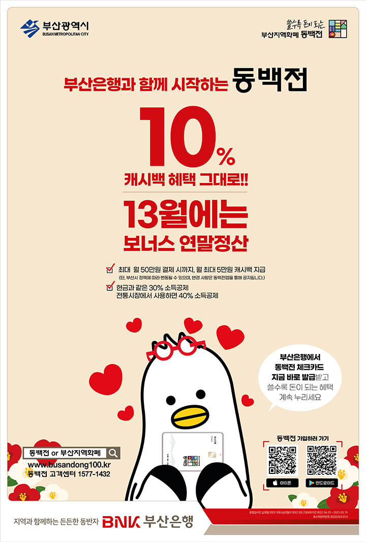 부산의 지역경제를 활성화하고 역내 중소 상공인의 경제적 자립을 위해 부산시가 2019년 12월 처음 발행한 동백전! 대형마트·백화점 등에서는 사용할 수 없지만, 사용한 금액의 일정 비율을 돌려주는 강력한 캐시백 혜택으로 부산시민들의 사랑을 받고 있다.