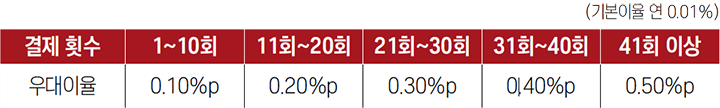 최대 0.50%p의 우대이율 또한 놓치지 말자. 이자결산기간 매월 말일 기준, 아래와 같이 카드 결제실적이 있는 경우 결제 횟수에 따라 아래와 같이 우대이율이 차등 적용된다(단, 동백전으로 충전하여 결제한 실적에 한함).