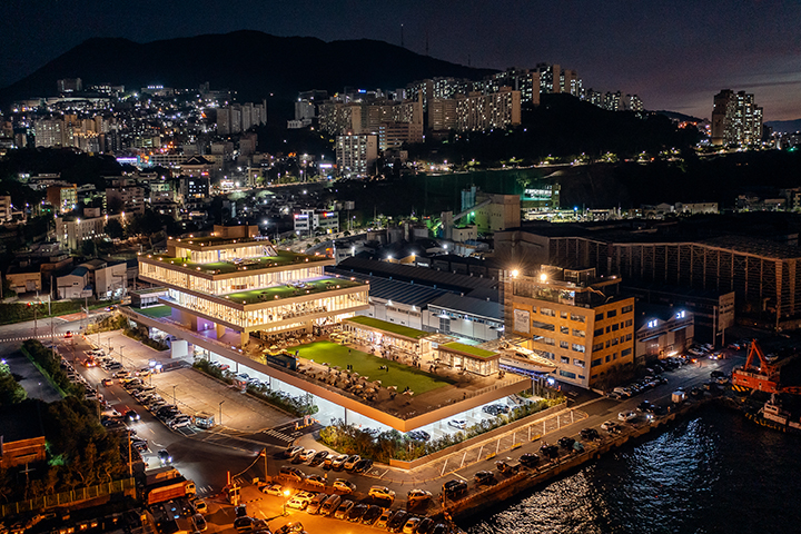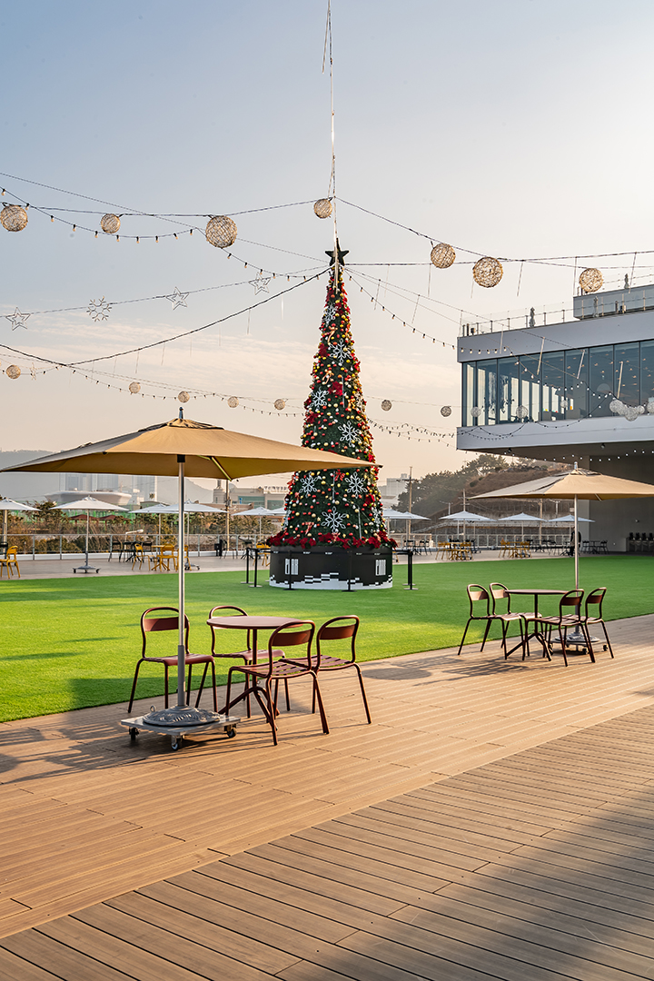 좀 더 섬의 내부로 들어가면 바다 옆으로 커다란 건축물이 보인 다. 지난 2021년 5월 개관한 이곳은 대한민국 최대 규모의 카페 피아크(P.ARK)다. 조선회사가 만든 복합문화공간이라는 독특한 정체 성에 맞게 멀리서 보면 커다란 선박을 닮아있다. 외관뿐 아닌 지하 1층부터 지상 6층에 이르는 내부도 배와 유사해 거대한 유람선 같은 느낌이 든다. 30여 명의 제빵사가 커다란 기계와 함께 맛있는 빵을 만드는 1층 프레드 팩토리를 지나면, 피아크의 꽃이라 할 수 있는 2층 오션 가든이 펼쳐진다. 배의 갑판을 닮은 이곳은 레스토랑과 갤러리 등 다양한 시설과 더불어, 영도바다가 한 눈에 들여다보이는 넓은 테라스가 매력적이다.