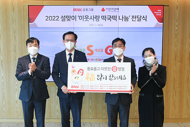 BNK는 1월 28일 본사에서 설을 맞아 부산사 회복지공동금회에 ‘사랑의 떡국떡’ 총 3000 ㎏(3㎏짜리 1,000상자)을 전달했다. BNK의 사랑의 떡국떡 행사는 복지시설 등에서 생활하며 명절에도 가족과 함께하지 못하는 이웃과 온정을 나누기 위해 진행하는 사회공헌 프로그램으로, 지역의 나눔 문화 확산을 위해 2019년부터 매 명절마다 진행하고 있다. 이날 행사를 통해 전달된 사랑의 떡국떡은 지역 복지시설 60여 곳의 아동과 노인, 장애인 등 지역의 소외된 이웃들의 명절나기에 사용될 예정이다.