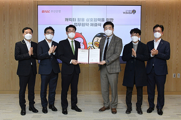 부산은행은 1월 25일 본점에서 애니메이션 제작 전문기업인 ‘스튜디오더블 유바바(주)’와 캐릭터 콘텐츠 활용을 위한 업무 협약식을 체결했다. 부산은 행은 이번 협약을 통해 캐릭터 콘텐츠 분야에서 다양한 사업을 진행할 예정이다. 그 첫 시도로 ‘우리’들의 이야기를 담은 평범한 사람들의 특성이 반영된 ‘B패밀리’ 캐릭터를 활용해 신규 금융 상품, 콘텐츠를 개발할 계획이다. ‘B패밀리’ 캐릭터는 3D 애니메이션으로 제작됐으며 재미 요소를 위해 개그맨 ‘김경식’이 시나리오 제작 감독으로 참가했다. ‘스튜디오더블유바바 (주)’는 ‘헬로!카봇’, ‘메카드볼’, ‘B패밀리’ 등을 제작했으며 ‘대한민국 콘텐츠 대상’에서 문화체육관광부장관상을 수상한 유망 기업으로, 핀테크 지원 프로그램 ‘BNK핀테크랩’ 4기 수료 과정에 있다.