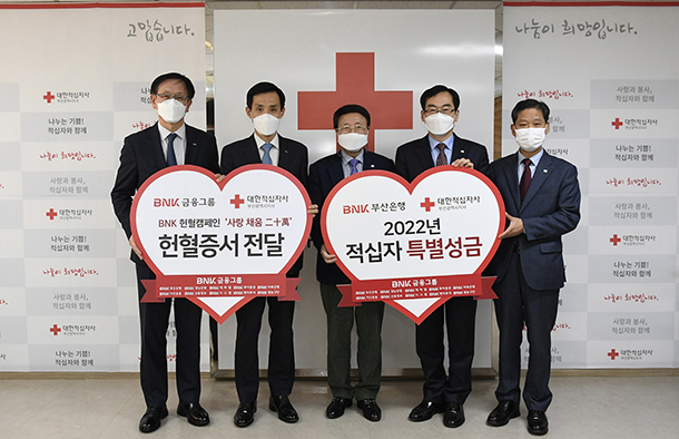 부산은행은 2007년부터 16년째 대한적십자사 특별성금을 기부하고 있으 며, 올해 부산은행을 포함한 BNK금융그룹 특별성금 총액은 1억 1,000만 원이다. 특별성금과 더불어 2021년 한 해 동안 진행된 임직원 헌혈 캠페인 ‘사랑나눔 二十萬’을 통해 모아진 헌혈증서 600여 장을 함께 전달하며 지역 온정 나눔에 손길을 더했다.