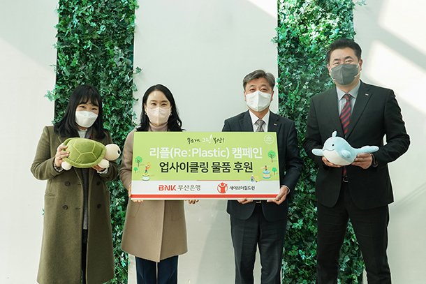 부산은행은 1월 27일 오전, 본점에서 ‘업사이클링 물품 후원’ 전달식을 갖고 ‘리플 캠페인’을 통해 제작된 친환경 물품을 사회복지법인 세이브더칠드런에 기부했다. 부산은행은 유동인구가 많은 벡스코 등 부산지역 10곳에 음료 수거 기능, 컵 세척기능, 수량확인 IoT 기능 등이 탑재된 수거함을 설치해 폐플라스틱 컵을 모았으며, 이를 통해 재탄생된 친환경 이불 및 인형 각 100개는 사회복지법인 세이브더칠드런을 통해 부산지역 소외계층 아동 100명에게 전달될 예정이다.