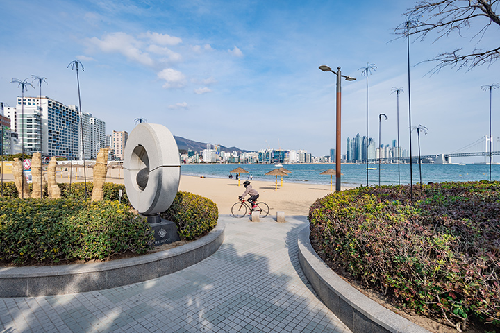 삼익비치아파트 바로 옆, 서너 개의 파라솔만 오도카니 백사장을 지키고 있다. 여름이면 해수욕을 즐기는 사람들로 가을이면 불꽃놀이를 구경하는 사람들로 복작이는 광안리해 변의 모습과는 사뭇 다른 분위기다. 남천해변공원은 이렇게 여유로운 봄날의 해변을 누리기에 맞춤인 장소다. 벤치에 앉아 바닷바람을 맞으며 사색을 즐기기에도, 삼삼오오 담소를 나누기에도 좋다. 꼭 벤치가 아니더라도 데크 계단에 걸터앉아 광안리 바다를 바라보고 있노라면 소란했던 마음이 고요해지는 듯하다. 남천해변공원은 광안대교와 마린시티가 한눈에 들어오는 경관을 자랑하는 만큼 밤이면 멋진 야경도 감상할 수 있다.