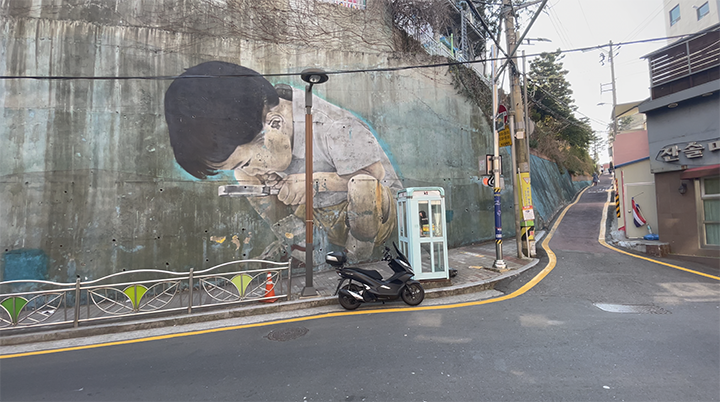 남천해변공원을 나서는 순간에도 횡단보도 건너편과 맞은편 골목 귀퉁이에 빵집이 보인다. 많은 골목 중 왼쪽 골목으로 들어갔더니 빵집보다 먼저한 소년이 시선을 사로잡는다. 호기심 가득한 눈빛으로 쭈그리고 앉아 손에 든 돋보기로 무언가를 열심히 관찰하고 있다. 높이 10m가 훌쩍 넘는 담벼락을 가득 채우고 있는 소년은 빵천동에 감성 한 스푼을 더해주는 그림으로 유명하다. 소년처럼 호기심을 안고 보물찾기를 하듯 인생 빵집을 찾아보자.