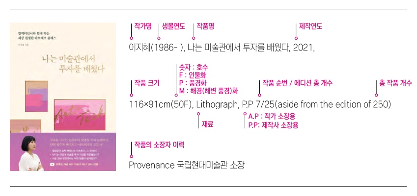 날로 그 높이를 더해가는 미술 시장의 위치와, 아트테크의 무궁무진한 매력까지 읽어 내려가다 보면 묘한 조바 심이 들 수도 있다. 이렇게 뜨거운 투자처를 두고도 낯설고 막연하게만 느껴지는 마음 탓일 것이다. 하지만 성급해져서는 안 된다. 원래 어떤 분야에서든 ‘기본기’가 만고의 진리인 것처럼, 성공적인 아트테크를 위해서도 역시 가장 중요한 것은 그림을 대하는 기본 전술을 익히는 것이다. 따라서 우리는 미술품 옆에 부착되어 작품의 정보를 간결하게 기입해둔 ‘캡션’을 이해해봄으로써 거래에 필요한 주요 요소들을 짚어보도록 하겠다.