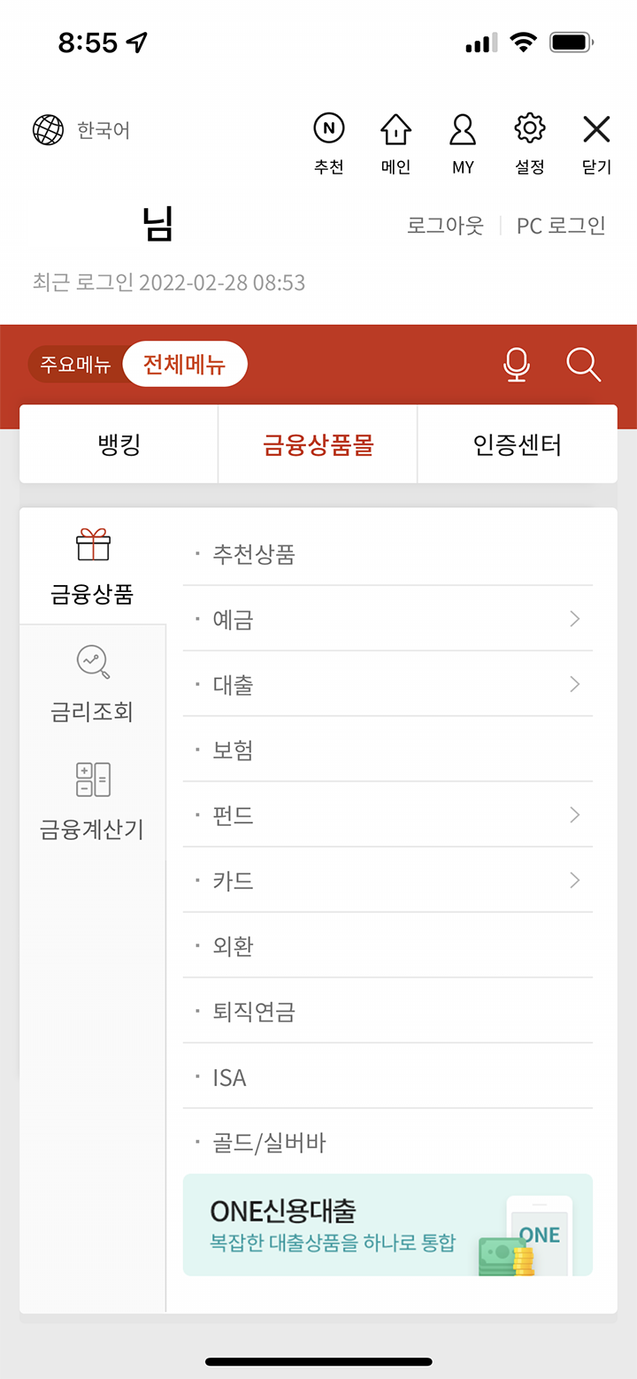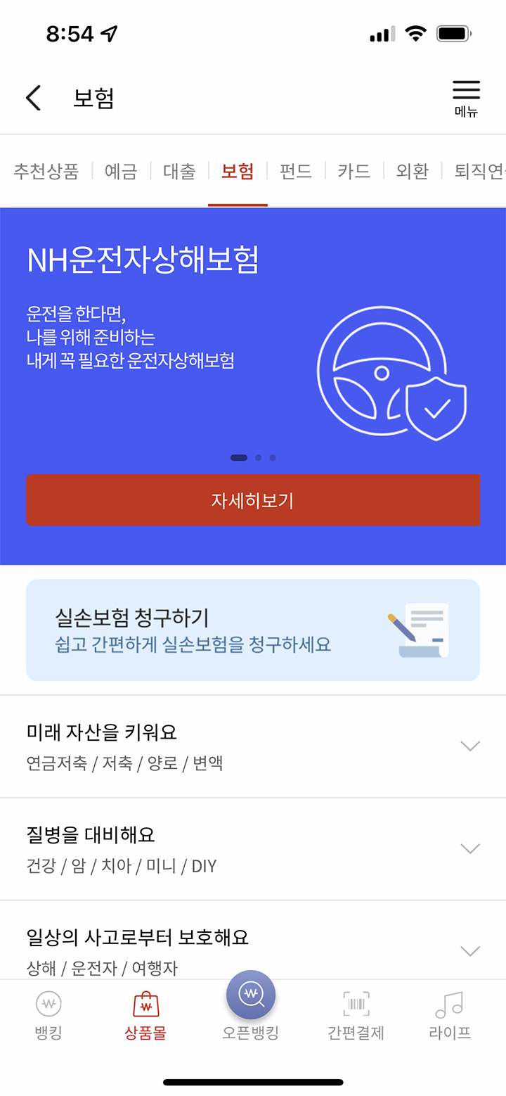 실손보험청구는 보험상품몰 메인 화면의 실손보험 청구 혹은 모바일뱅킹의 보험 카테고리의 실손보험 청구를 통해 진행 가능합니다.