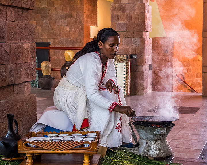 _에티오피아에서 전통 방식으로 커피 원두를 로스팅 하고 있는 여인