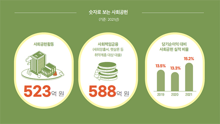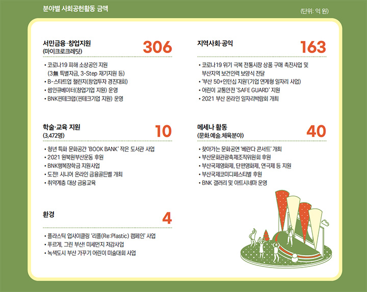 전대미문의 코로나19 위기 상황을 겪으면서 은행권 전체적으로 대면 활동에 제약이 생기고 경기 침체로 수익성이 악화되는 등 어려움을 겪으면서 사회공헌활동 또한 소폭 축소되었다. 하지만 이런 상황 속에서도 부산은행은 지역과 함께하는 든든한 동반자 역할에 최선을 다하고자 다양한 노력을 기울여왔다. 특히 ESG경영 실천을 통해 기업 이윤을 지역사회에 환원하는 한편, 구체적이고 차별화된 계획에 기반한 사회공헌활동을 전개함으로써 기업의 사회적 책임을 완수하고자 했다.