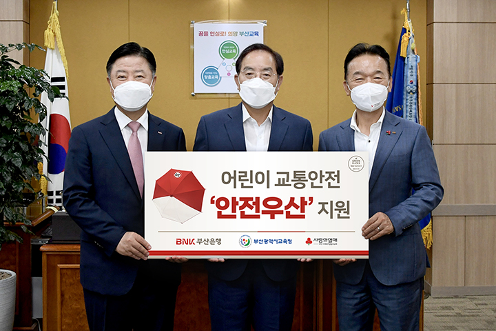 부산은행은 7월 18일 부산시교육청에서 어린이 교통안전을 위한 ‘안전우산’ 전달식을 가졌다. ‘안전우산’은 부산사회복지공동모금회를 통해 부산지역 초등학교 1학년 전체 2만 6,000여 명에게 전달된다. 우천시 보행자가 차량을 볼 수 있도록 3면이 투명한 재질로 제작된 ‘안전우산’은 차량운전자의 안전운행을 위해 빨간 색상과 반사띠를 둘러 원거리에서도 보행자를 확인할 수 있는 것이 특징이다. 한편, 부산은행은 2018년부터 가방 안전덮개와 안전옐로카드 등 어린이 교통안전을 위한 다양한 사회공헌사업을 진행 중이며, 지난해에는 어린이 교통사고 예방을 위해 강서구와 영도구, 사하구 스쿨존 세 곳에 활주로형 횡단보도와 안전문구를 담은 로고젝터를 구축했다.