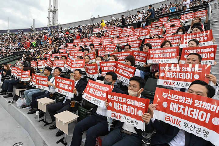 부산은행은 7월 12일 부산 시민과 함께하는 ‘BNK X 롯데자이언츠 매치데이’ 행사를 개최했다. 롯데자이언츠 홈구장인 사직야구장에서 열린 ‘매치데이’ 행사에는 부산은행 모바일뱅킹을 통해 사전 추첨한 부산시민과 영업점을 통해 초청한 고객, 부산은행 임직원 등 총 18,000명을 초청해 진행됐다.