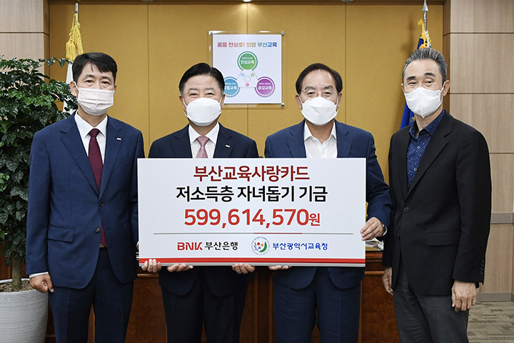 부산은행은 7월 18일 부산시교육청에서 ‘저소득 가정 자녀 돕기 기금’ 5억 9,900여만 원을 전달했다. 매년 부산광역시교육청 산하 공무원 및 사립학교 교직원을 대상으로 발급된 ‘부산교육사랑카드’ 이용액 중 일부를 적립해 부산시교육청에 전달하고 있으며, 2005년부터 올해까지 전달된 ‘저소득 가정 자녀 돕기 기금’ 규모는 약 59억여 원으로 매년 지역 저소득층 자녀의 급식비 지원에 사용된다.