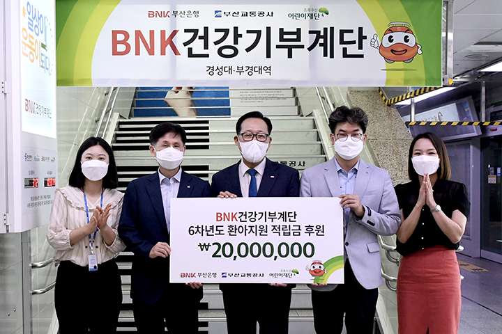 부산은행은 7월 22일 부산지하철 2호선 경성대·부경대역 승강장에서 초록우산어린이재단 부산지역본부에 ‘BNK건강기부계단’ 적립금 2,000만 원을 전달했다. ‘BNK건강기부계단’은 부산은행이 지난 2016년 6월 부산지역 최초로 지하철 2호선 경성대·부경대 역에 설치했으며, 이 시설을 이용하는 시민 1인당 10원의 기부금을 적립하는 시민 참여형 사회공헌사업이다. 부산은행은 지난해 6월부터 1년간 80만 여명의 시민들이 계단을 이용해 적립된 800만 원에 1,200만 원을 더해 총 2,000만 원의 기부금을 조성했다. 이 기부금은 초록우산어린이재단을 통해 소외계층 환아들을 위한 치료비로 사용될 예정이다.