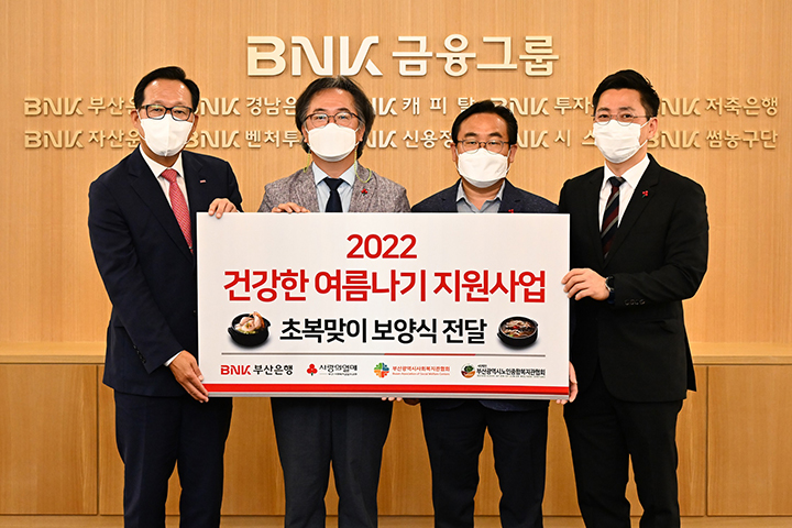 부산은행은 7월 13일 본점에서 부산사회복지공동모금회, 부산사회복지관협회, 부산노인종합복지관협회와 함께 ‘부산은행과 함께하는 건강한 여름나기 보양식 지원사업’ 전달식을 가졌다. ‘건강한 여름나기 지원 사업’은 지역 취약계층에게 여름철 보양식을 지원하는 여름 특화 사업공헌사업으로 부산은행이 지난 2007년부터 16년째 이어오고 있다. 부산은행은 지역 노인복지관 및 종합사회복지관 50곳에 부산사회복지공동모금회를 통해 삼계탕과 육개장이 포함된 보양식 2,500세트를 전달할 예정이다.