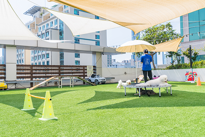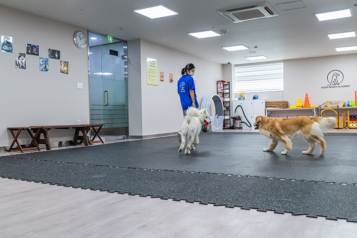 해운대 중동역 근처에 있는 앨리스 도기 아카데미는 대한민국 최초 교육청 인가를 받은 반려견 훈련 아카데미이다. ‘내 반려견은 내가 가르친다’라는 모토를 가지고 반려견과 반려인이 동반자로서 함께 지낼 수 있도록 도와주고 있는 공간이다. 뿐만 아니라 반려산업 전문가 양성 및 전문 훈련사 양성 아카데미와 병설 유치원도 함께 운영하고 있다. 앨리스 도기 아카데미는 전문가 5명이 상주하고 있으며, 문을 열면 반려인들을 위한 휴게실이 보이고, 왼쪽에는 뷰티실과 강의실, 그리고 안쪽으로 들어가면 대강의실 등이 보인다. 그리고 옥상으로 올라가면 반려동물이 신나게 뛰어놀 수 있는 풀밭과 다양한 놀이기구들이 준비되어 있는 공간이 나온다. 따뜻한 햇살 아래 반려견들의 얼굴엔 웃음꽃이 떠나질 않고 행복하게 뛰어다니는 모습에 그저 흐뭇하기만 하다.