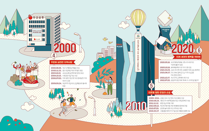 2014년 11월 4일 본점 신축 준공식을 거행하고 새로운 도약의 물꼬를 튼 부산은행은 지역의 발전과 고객의 성공에 실질적인 도움이 되겠다는 각오로 지역밀착형 사회책임사업인 ‘행복한 금융’ 사업을 추진하였습니다. 이를 통해 고금리 대출로 어려움을 겪는 서민에 대한 금융지원은 물론, 기술금융 및 관계형 금융을 통한 기업 유치 및 중소기업 지원에 앞장섰습니다. 또한 지난 2020년 코로나19 사태 이후 많은 중소기업과 영세 자영업자들이 어려움을 겪자, 3無 대출을 비롯해 23조 2,000억 원에 상당하는 금융 지원을 실시하는 등 금융 및 비금융 지원에 나선 점을 높이 평가받아 서민금융대상 ‘기획재정부장관상’을 수상했습니다. 또한 녹색분야 및 취약계층 등 사회분야 지원을 위해 1,000억 원 규모의 ESG채권을 발행하기도 했습니다. 부산은행은 앞으로도 지역의 중소기업, 영세 자영업자, 서민들이 어려울 때 기댈 수 있는 든든한 버팀목이 되어 지역의 밝은 미래를 열어가겠습니다.