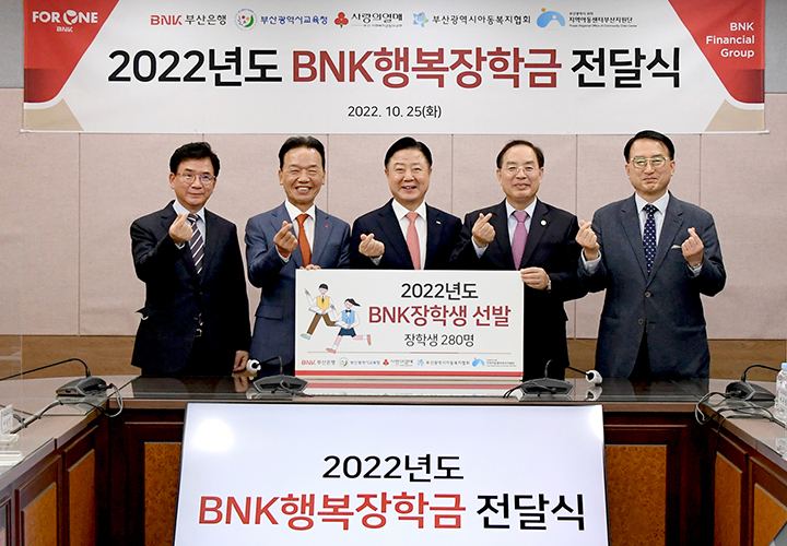 부산은행은 10월 25일 부산광역시교육청에서 지역의 미래 인재 육성을 위해 부산사회복지공동모금회에 ‘BNK행복장학금’ 5억 원을 전달했다. ‘BNK행복장학금’은 2007년부터 부산은행이 ‘BNK희망나눔재단’을 통해 매년 지역의 우수인재 육성과 모범학생 지원을 위해 추진 중인 장학 사업이다. 현재까지 8,000여 명의 학생에게 총 75억여 원의 학업장려금을 지원했다.