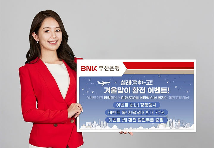 부산은행은 12월 19일 외화 환전고객을 대상으로 2023년 2월 28일까지 겨울맞이 ‘설래(雪來)-고!’ 환전 이벤트를 실시한다. 이번 이벤트는 부산은행 전 영업점(김해공항 및 국제여객터미널 제외)에서 미화 500달러 상당액 이상을 환전하는 고객을 대상으로 실시하며, 주요통화(USD, EUR, JPY)는 70%, 기타통화는 50%까지 환율 우대를 해준다. 또한 이벤트 기간 중 환전 고객을 추첨해 경품을 제공하며, 선착순 2023명에게는 부산은행 영업점에서 사용할 수 있는 환전 할인쿠폰 2000원 권을 증정한다. 자세한 사항은 부산은행 고객센터 및 홈페이지, 모바일뱅킹 이벤트 페이지에서 확인할 수 있다.
