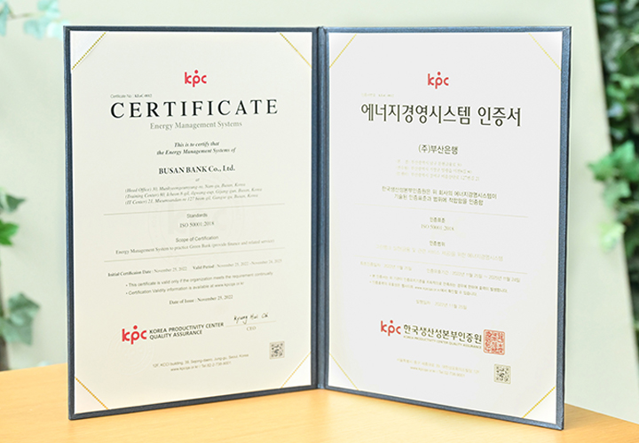 부산은행은 12월 6일 에너지 경영에 대한 국제적인 표준인 ‘ISO 50001’을 획득했다. ‘ISO 50001’ 국제표준은 회사 내 주요 건물의 에너지 사용 현황 및 에너지 관리를 위한 내부 프로세스를 점검해, 효율적인 에너지 경영을 실천하고 있는 회사에 인증서를 발급해 주는 국제적인 표준 인증제도이다.