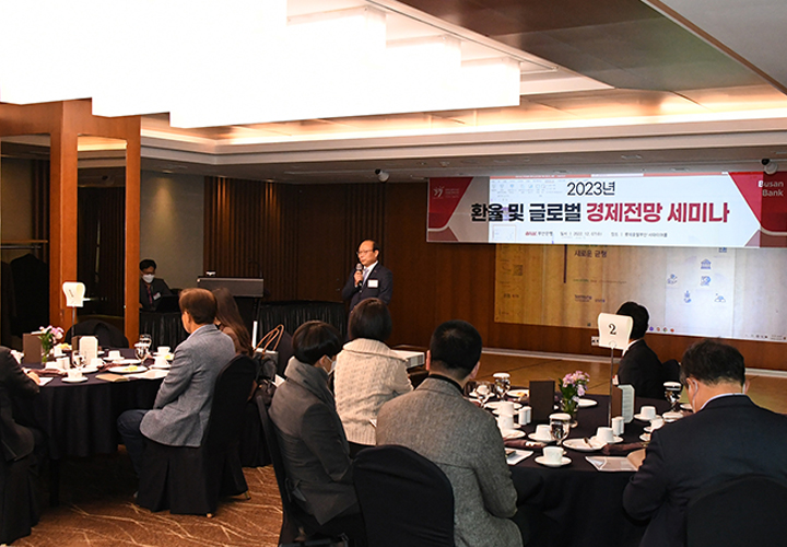 부산은행은 12월 7일 롯데호텔 부산에서 부·울·경 수출입 우수기업을 대상으로 ‘2023 환율 및 글로벌 경제 전망’ 세미나를 개최했다. 이번 세미나는 국내외 금융 및 외환시장 이슈, 주요 글로벌시장 동향 등의 정보를 공유해 지역 수출입 기업의 환리스크 관리에 실질적인 도움을 주기 위해 마련됐다. 세미나에는 삼프로TV, 한경TV 등에 출연한 삼성선물(주) 리서치센터 전승지 수석 연구위원이 강사로 나서 ‘최근 환율변동성 확대의 배경과 향후 경제 전망’을 주제로 특강을 진행해 참석자들의 큰 호응을 얻었다.