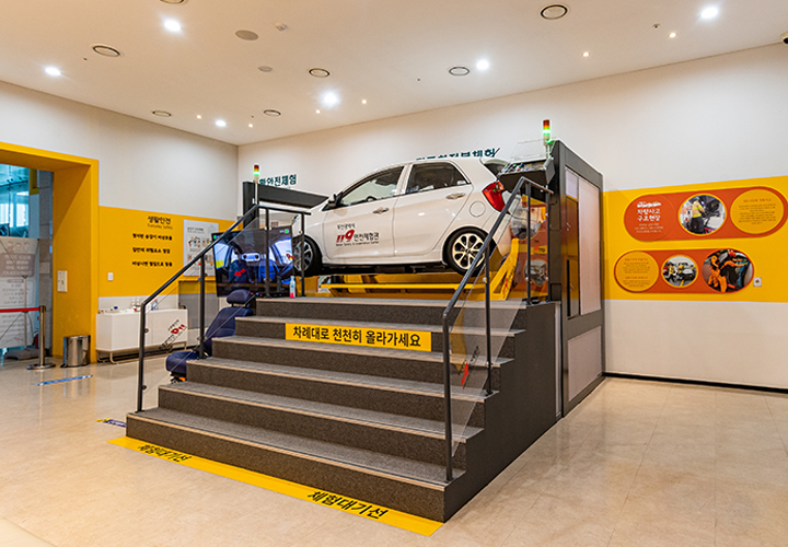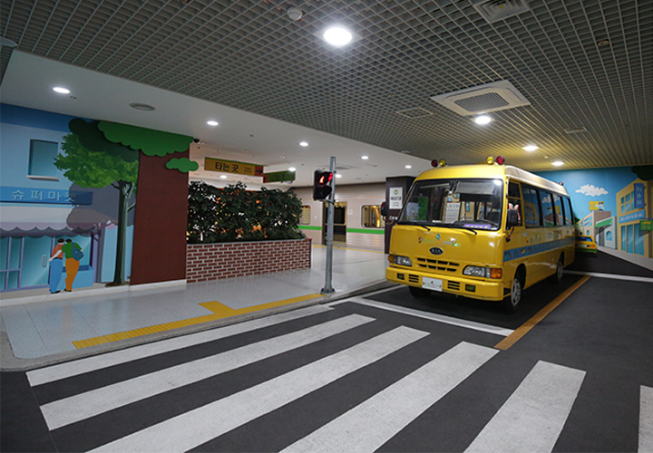 2층에 마련된 실외교육장은 신호등, 횡단보도, 보행로 등 실제 도로환경과 동일하게 만들어 놓은 공간으로 어린이 10대 사고 예방중심으로 체험교육이 진행된다. 이곳에서는 체험 학생들을 두 팀으로 나누는데, 한 팀은 보행자가 되어서 횡단보도, 육교 등을 이용할 때 안전 수칙을 배우며 다른 한 팀은 페달 자동차에 탑승해 신호를 지키며 운전자의 시선으로 안전 수칙을 배우는 시간을 가진다. 자원봉사자들이 운전하는 아이들을 옆에서 케어해 주기에 안전하게 체험교육이 이뤄진다.