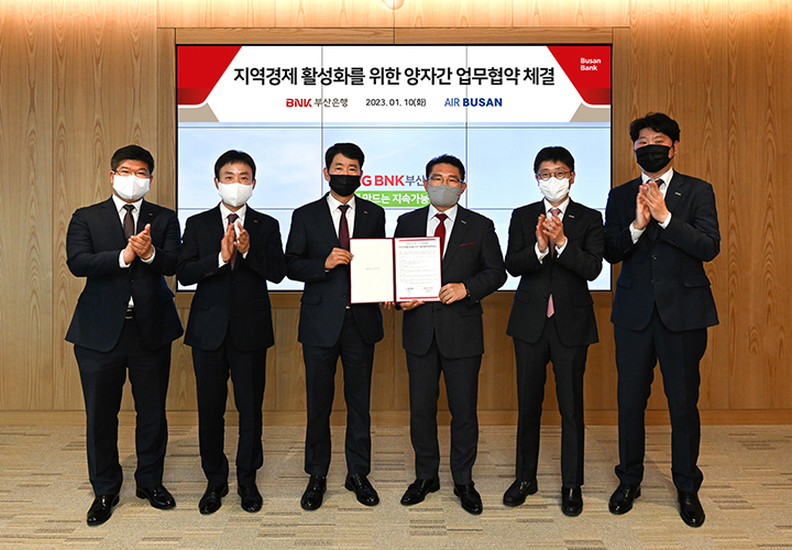 부산은행은 1월 10일 본점에서 지역경제 활성화 및 동반성장을 위해 에어부산과 업무협약을 체결했다. 이번 협약으로 부산은행의 금융 상품 출시와 에어부산 이용고객 증대를 위한 홍보·마케팅 협력과 더불어 시너지 증진을 위한 사업도 추진하기로 했다. 특히 부산은행은 에어부산의 쿠폰 할인 혜택을 연계한 적립식 상품을 출시하는 등 다양한 금융 서비스를 제공해 부산시민들의 혜택을 늘리고, 부산 여행을 준비하는 국내 고객들의 유입 증가로 지역경제 상권 활성화를 도모한다는 계획이다.