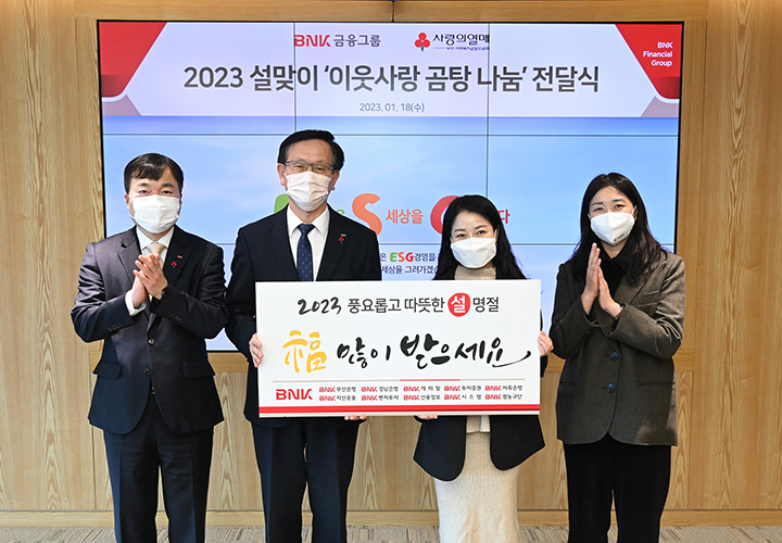 BNK금융그룹은 1월 18일 본사에서 지역 이웃과의 나눔실천을 위한 설맞이 ‘사랑 나눔 행사’를 갖고 부산사회복지공동모금회에 ‘한우 곰탕 세트’ 1,000상자를 전달했다.