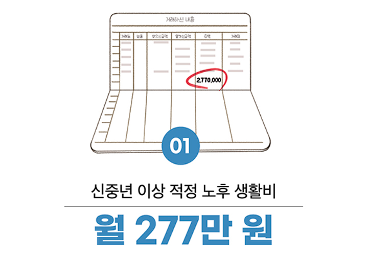 국민연금공단 국민연금연구원은 올해 1월 3일 ‘제9차(2021년도) 중·고령자의 경제생활 및 노후준비 실태’ 조사 보고서를 발표했다. 이 보고서에 따르면 중·노년층들이 생각하는 적정 노후 생활비는 부부 기준 평균 월 277만 원, 1인 가구 177만 3,000원 수준으로 조사됐다. 이는 부부가 국민연금을 20년 납입했을 때 평균 196만 원을 받는다는 점을 고려하면 부족한 수준이다. 따라서 현재 대부분의 중·노년층들은 국민연금뿐만 아니라 자식·친척들에게 받는 생활비와 별도로 근로 활동을 통해 노후 생활비를 충당하는 것으로 나타났다. 그러므로 신중년을 앞두고 있는 분들은 미리 노후를 대비한 저축 또는 개인연금을 들어두거나 미래 일거리 및 소득원 확보를 위해 노력해야 할 것으로 보인다.