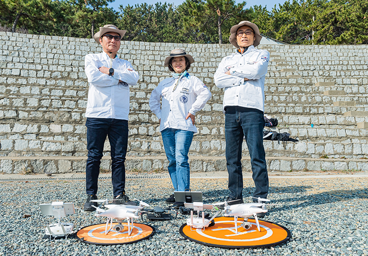50~60대가 모여 드론으로 인생 2막을 여는 드론 봉사 단체 ‘동의대 드론 봉사단’이 있다. 현재 신중년 60명이 활동하고 있는 드론 봉사단은 군과의 합동 훈련, 환경 개선을 위한 바닷가 순찰, 조난자 구조 활동, 쓰레기 혹은 불법 어선 수색, 산불 사태 파악 등 다양한 분야에서 봉사활동을 이어 나가고 있다. 봉사단은 ‘50+생애재설계대학’에서 배운 경험에서 그치지 않고 기술을 사회에 환원하자는 취지로 창단되었다. 봉사활동을 통해 많은 분이 삶에 새로운 활력을 느낀다고 한다. 대부분의 신중년이 그동안 먹고 사는 데에만 집중해왔다면, 이제는 인생의 후반부에서 즐거움과 보람을 발견하기 위해 봉사단을 찾는다. 처음에는 ‘내가 할 수 있을까?’라는 걱정에 어려워 하지만, 개인의 수준에 맞는 교육을 통해 점차 용기와 자신감을 가지게 된다고. 실제로 교육 과정을 수료한 분들 중에서 삶에 자신감을 되찾았다는 연락을 보내오시는 분들도 많다.부산시는 바다를 끼고 있어 천혜의 자연환경을 갖추고 있다. 드론 봉사단은 부산시와 해양을 지키는 일에 솔선수범하며 매주 각 구·군을 다니고 있다. 앞으로 드론 사업이 사회에 핵심적인 중추 역할을 하게 될 것으로 여겨지는 만큼 다양한 활동을 전개해나가는 것이 봉사단의 목표이자 과제가 아닐까.