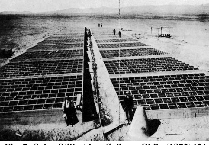 태양열로 염수를 증발시켜서 수증기를 모은다고 해서, 꼭 이렇게 적은 양의 식수만 만들 수 있는 것은 아닙니다. 필요에 따라서, 큰 규모의 물 공장을 만들 수도 있지요. 1872년에 칠레의 라스 살리나스(Las Salinas)에는 주변의 은광이나 질산 칼륨 광산 노동자에게 물을 공급하기 위해서, 4,700㎡ 면적의 태양열 증류식 담수기를 건설했다고 합니다. 목재 프레임과 유리판을 이용해서 만들었는데, 약 40여 년간이나 운영하면서, 하루에 약 23톤의 담수를 생산했다고 합니다.