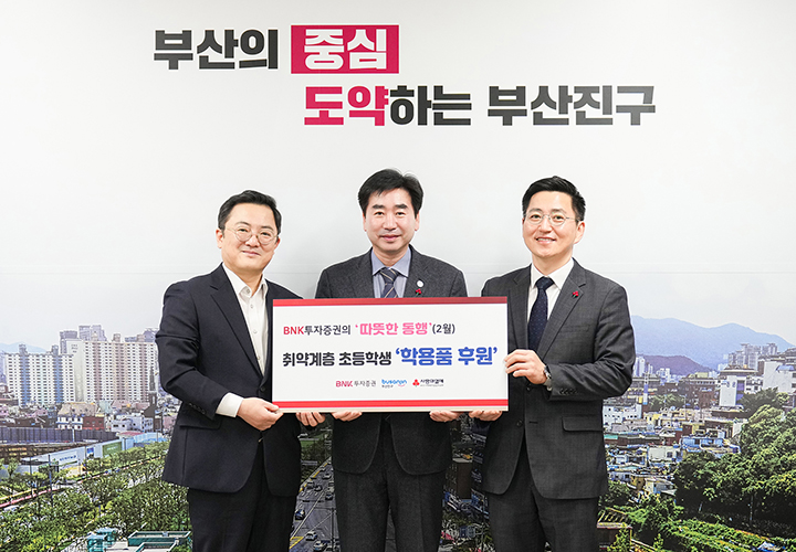BNK투자증권이 입학 및 신학기 시즌을 맞아 지역 어린이들에게 총 1,000만 원 상당의 학용품 400세트를 기부한다. BNK투자증권은 2월 23일 부산진구청을 방문해 학습용 노트와 필기구 등 9종으로 구성된 학용품 세트 전달식을 가졌다. 지역 어린이들의 학업 지원을 위해 마련된 이번 나눔 사업은 BNK투자증권의 사회공헌테마인 ‘따뜻한 동행’의 일환으로 추진됐다. 또, 24일에는 경남 창원의 마산회원구청을 방문해 학용품 세트를 기부했다. 이번에 기부되는 학용품 세트는 해당 지역 관할 구청과 사랑의 열매를 통해 어린이들에게 전달될 예정이다.