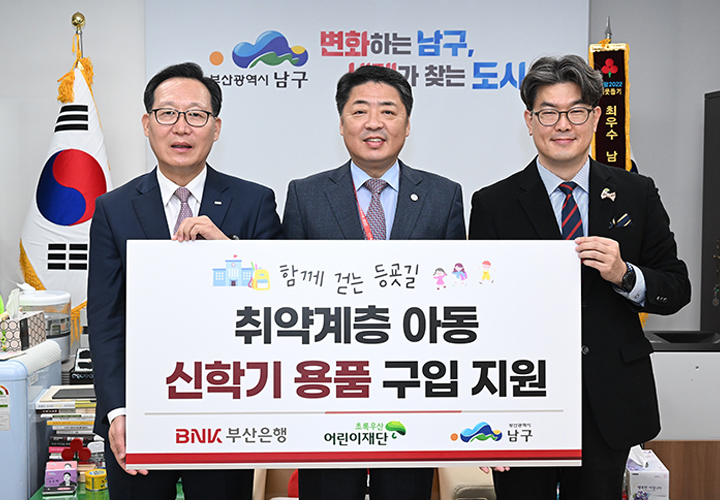 부산은행은 2월 17일 부산 남구청에서 부산 남구청, 초록우산어린이재단과 함께 신학기 지원사업 ‘함께 걷는 등굣길’ 후원 전달식을 가졌다.