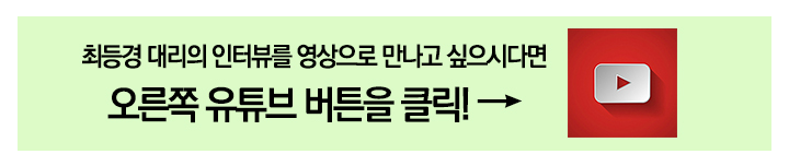 최등경 대리는 상담 업무를 맡으면서 성격이 많이 변 했다고 한다. 입사했을 때만 해도 고객의 눈도 제대로 못 마주쳤는데 하루에 수많은 고객을 만나다 보니 대 화의 기술과 업무 지식이 점점 향상됐다고. 또 지점에 서 실적이나 업무 관련 목표를 세우고 그것을 달성하 기 위해 의욕을 내고 선의의 경쟁을 하는 것이 자신의 삶에도 긍정적으로 작용하고 있다고 말한다. 고객들 과의 따뜻한 교감, 그리고 목표 달성을 통해 얻는 성 취감과 자부심은 최등경 대리의 삶을 매일 밝은 에너 지로 가득 채우고 있다.