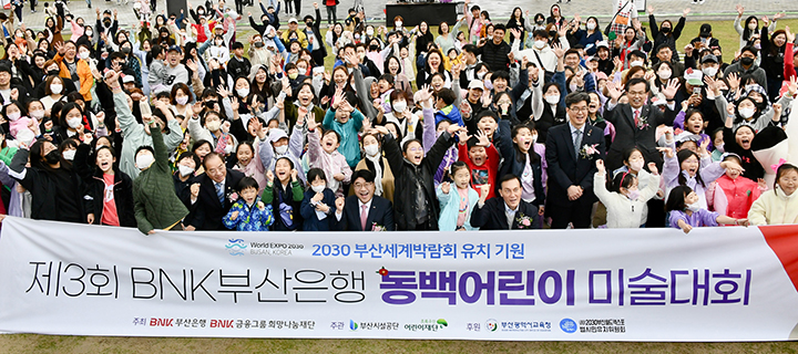 부산은행은 4월 15일 부산시민공원에서 제3회 동백어린이 미술대회 시상식을 개최했다. 2030부산세계박람회 유치를 기원하며 Expo, Spring, Green park의 3개 주제로 열린 미술대회에는 추첨을 통해 선정된 부산 지역 초등학생 500명이 참가했다. 수상자는 저학년 부문 대상에 김시후 학생(동평초 2학년), 고학년 부문 대상에 장연서 학생(명호초 4학년)이 각각 부산광역시교육감상을 수상했다. 대상을 포함해 각 부문별로 금상 2명, 은상 3명, 동상 5명, 특별상 56명 등 총 134명의 학생이 수상의 기쁨을 누렸다. 미술대회 수상작은 부산시민공원 다솜갤러리에 5월 말까지 전시되며, 시민 누구나 관람이 가능하다. 한편 이번 미술대회에는 부산시설공단과 초록우산어린이재단도 함께 참여해 다채로운 문화공연과 체험행사를 열어 엑스포 유치를 위한 열정을 더했다.