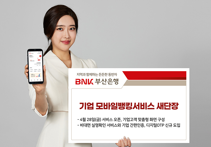 부산은행은 4월 28일, 기업고객의 편리한 모바일뱅킹 이용을 위해 부산은행 ‘기업 모바일뱅킹’ 서비스를 새롭게 선보인다. ‘기업 모바일뱅킹’에서는 비대면 실명확인 서비스를 도입해 은행 방문 없이 모바일뱅킹 신규, 입출금 계좌 개설, 금융상품 가입, 제신고 업무 등이 가능하게 됐다. 복수 사업자를 위한 사업자 통합관리, 신용카드 사업장 관리, 공과금 통합조회·납부 등 다양한 비대면 기업금융 서비스도 제공한다.