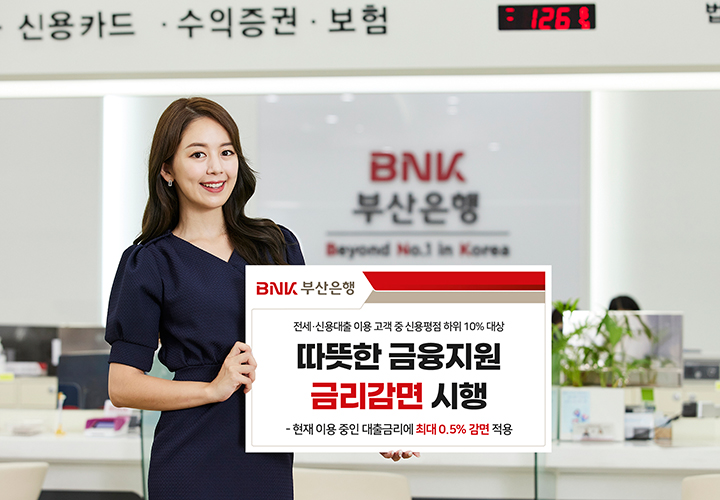 부산은행은 지난 3월 시행한 ‘따뜻한 금융지원’의 일환으로 기존 대출 이용 고객 중 저신용자를 대상으로 4월 26일 금리 감면을 시행한다. 금리감면 지원 대상은 3월 말을 기준으로 부산은행에서 전세대출 및 신용대출을 이용 중인 신용평점 하위 10%(NICE 724점 이하 또는 KCB 670점 이하) 고객이다. 지원 대상에 해당될 경우 별도의 신청 없이 현재 적용 중인 대출금리에서 0.5%p 감면 적용된다. 감면금리는 시행일 이후 다음 이자 납입일부터 현재 대출 만기까지 반영되며 대상자에게는 금리감면 지원 내용을 SMS로 안내할 예정이다.