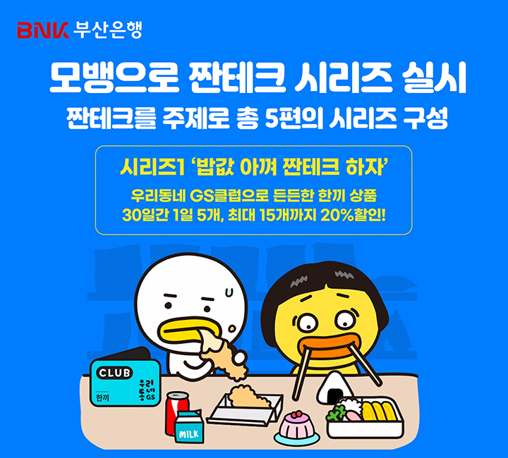 부산은행은 4월 10일 불필요한 소비를 줄여 꼭 필요한 곳에 지출하자는 의미를 담아 ‘모뱅으로 짠테크 시리즈’ 캠페인을 실시한다. 짠테크를 주제로 총 5편으로 구성된 ‘모뱅으로 짠테크 시리즈’는 부산은행만의 차별화된 비대면 캠페인으로, 참여 고객에게는 선착순 또는 추첨을 통해 시리즈별 주제에 맞는 혜택을 제공한다. 먼저 4월 10일부터 30일까지 시리즈 1편 ‘밥값 아껴 짠테크 하자’를 진행했으며, 반려동물을 주제로 한 ‘댕댕이/댕냥이 사료값 아껴 짠테크 하자’, 문화공연 관련 ‘짠테크도 하고, 오페라의 유령도 즐기고’, 짠테크에 특화된 수신상품 론칭 등 순차적으로 시리즈를 이어갈 예정이다. 자세한 사항은 부산은행 모바일뱅킹에서 확인 가능하다.