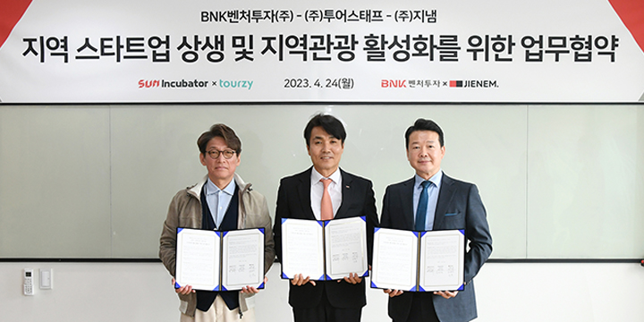 BNK금융그룹 계열사인 BNK부산은행과 BNK벤처투자가 스타트업과의 상생 협력 지원을 통해 지역 창업생태계 활성화에 힘을 보탠다. 4월 24일 부산은행의 스타트업 육성 플랫폼인 ‘썸 인큐베이터’에서 ㈜투어스태프, ㈜지냄과 함께 ‘지역 스타트업 상생 및 지역 관광 활성화를 위한 업무협약’을 체결했다. ㈜투어스태프는 부산은행 ‘썸 인큐베이터’ 7기로 선정되어 스타트업 육성 프로그램을 이수중인 2인승 전기자동차 모빌리티 공유 플랫폼이며, ㈜지냄은 온오프라인 숙박 중개 플랫폼을 운영하는 업체로 BNK벤처투자의 경영컨설팅을 통해 성장 중이다. BNK금융