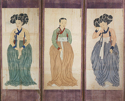 우리나라에서 여인을 그린 그림은 삼국시대부터 꾸준히 그려졌던 것으로 보인다. 고려시대에는 ‘여인도(麗人圖)’, ‘사녀도(仕女圖)’ 등으로 불리며 제작되었다. 그러나 본격적으로 ‘미인도’라고 부를 수 있는 것은 조선 중기 이후 풍속화에서부터 나타난다. 그중 우리에게 가장 친숙한 미인도가 바로 혜원 신윤복의 <미인도>다. 신윤복 특유의 섬세한 선과 아름다운 채색이 잘 드러난 작품으로 간송미술관에 있는 <신윤복 필 풍속도 화첩>에 속해 있다. 이 화첩은 일본으로 유출되었던 것을 1930년 간송 전형필이 구입해 새로 틀을 짠 것으로, 18세기말 조선시대 생활사와 복식사 연구에도 중요한 작품으로 평가받고 있다. <미인도>의 모델이 된 여성은 풍류세계에 몸담고 있던 기생으로 추측된다. 당시 사회제도상 여염집 규수는 외간 남자 앞에 그 모습을 드러낼 수 없었기 때문이다. 탐스런 가체를 얹은 머리에 가슴 윤곽이 보일락 말락 기장이 짧고 소매통이 좁은 저고리, 열두 폭 큰 치마가 풍만하게 부풀어 오른 차림새는 여체의 관능미를 드러내는 자태이다. 또한 쪽빛 치마 밑으로 살짝 드러낸 하얀 버선발과 왼쪽 겨드랑이 근처에서 흘러내린 두 가닥 주홍색 허리끈, 일부러 고를 매지 않고 풀어헤친 진자주 옷고름이 조선시대 사내들을 홀리게 했을 것이다.