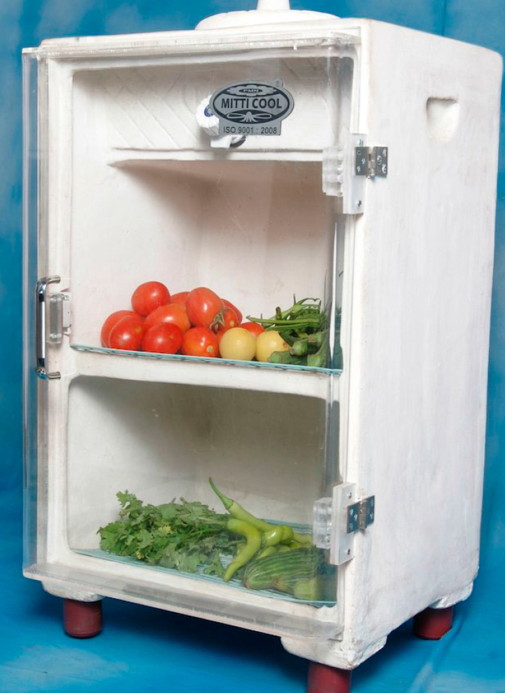 인도의 도예가 만수크 프 라 자 파 티 ( M a n s u k h Prajapati)는 이러한 항아리 냉장고와 같은 원리이지만, 보다 현대적인 냉장고 디자인의 미티 쿨(Mitti cool) 냉장고를 개발하였습니다. 미티(Mitti)는 힌디어로 흙이라는 뜻입니다. [그림 2]와 같이, 질그릇 소재로 냉장고 형태를 만들고, 투명 문을 부착해서 냉장고 속 내용물이 보이도록 하였습니다. 냉장고 위쪽에 물을 담는 부분이 있어서, 여기에 물을 담으면, 질그릇 소재의 냉장고 전체가 젖어 들고, 물이 증발되면서 식혀주는 방식입니다. 앞의 항아리 냉장고와 마찬가지로 물이 잘 증발할수록 냉각이 잘되므로, 바람이 잘 통하도록 하여 성능을 높일 수도 있습니다. 적정기술이라고 하기에는 좀 복잡하긴 하지만, 아인슈타인(Albert Einstein)도 실라르드 (Leo Szilard)와 함께 전기가 필요 없는 냉장고를 발명하기도 했습니다. 이 경우에는 냉매로 물 대신 액체부탄을 사용했고, 전기 대신에 열에너지를 사용했습니다.