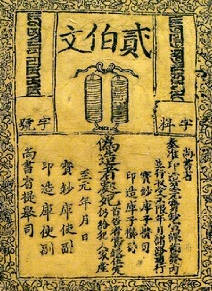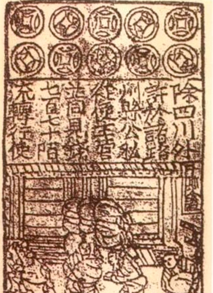 이럴 때 탄생한 것이 바로 지폐다. 지폐의 기원은 당 헌종 시절에 탄생한 ‘비전(飛錢)’이었는데 돈이 다른 지역으로 날아갔다고 해서 이름 붙여졌다. 상인이 관청에 동전을 제출하면 그만큼 액수가 적힌 증명서를 발급받을 수 있다. 그리고 다른 지역으로 이동해 현지 관청에 제출하면 액면에 적힌 동전을 받을 수 있었다. 비전이 탄생함으로써 상인들은 무거운 동전을 지닐 필요가 없어 편리해졌고 동전거래가 줄어들게 됨으로써 동전 부족 현상도 일부 해소될 수 있었다. 하지만 비전은 화폐가 아니고 한번 사용하면 폐기되었기 때문에 지폐라 보기 어렵다. 본격적인 지폐 발행은 송 태종 때 사천성에서 시작되었다. 성도의 대상인 16호가 협의해 교자포라는 조합을 결성하고 ‘교자(交子)’라는 어음을 발행했다. 이렇게 만들어진 돈을 유망 사업에 투자해 이익을 얻기 위함이었다. 그런데 이 교자의 신용에 문제가 생겨 혼란이 생기자 정부는 직접 발행에 나섰고 사천성 전체에서 통용되는 유통 화폐가 되었다. 1161년에 이르러 정부 차원의 교자포를 설치하고 본격적인 발행을 시작했다. 이렇게 교자 발행을 북송 전체로 확장함으로써 본격적인 국가주도의 지폐 발행 시스템이 시작됐던 것이다. 유럽에서 지폐 발행이 시작된 것이 이때로부터 500년 뒤인 1661년이었다는 점과 비교해 보면 얼마나 빨리 시작되었는지 알 수 있다.