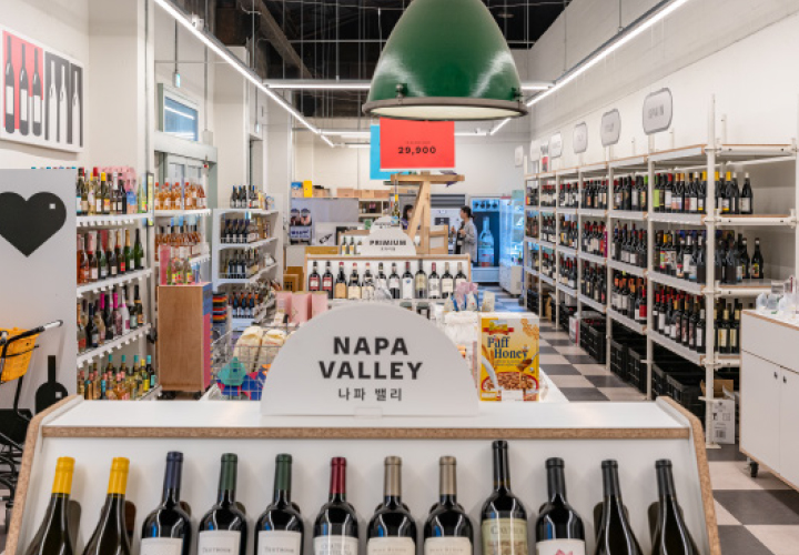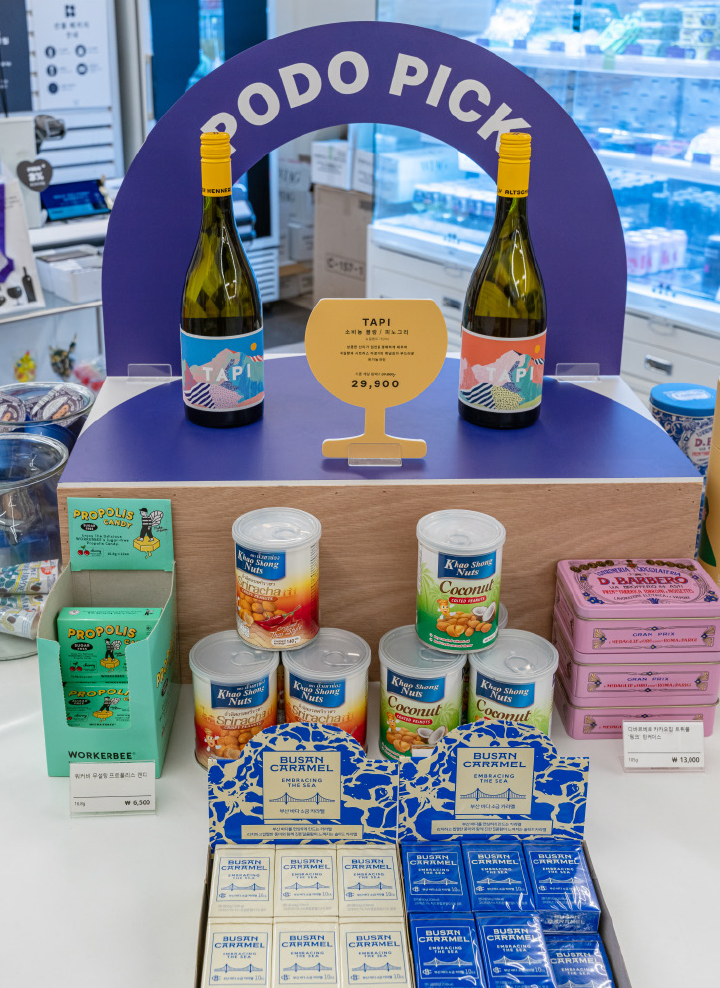 부산 최초의 창고형 와인 프랜차이즈, 와인아울렛 포도. 창고형 와인아울렛이 되기까지 와인을 콘텐츠로서 소비할 수 있는 방법이 무엇이 있을까 고민한 끝에 5년 전에 캐주얼하게 와인을 소비할 수 있는 와인바로 시작하여 지금은 리테일숍으로 확장했다. 누구나 쉽게 유추할 수 있는 직관적 네이밍으로 브랜딩에 성공하여 전포 1호점을 기점으로 장전점, 양산점, 광안점 등 현재는 52호점 오픈을 앞두고 있다. 특히, 접근하기 어려웠던 와인에 대한 진입 장벽을 허물 수 있도록 국내 유명 디자이너들과의 협업을 통해 친근함을 느낄 수 있는 키치하고 캐주얼한 야외 공간을 마련한 점이 눈에 띈다. ‘PODO’ 외벽을 배경으로 사진을 찍고, 와인을 즐길 수 있어 코로나19 시기에도 많은 사람이 이곳 야외공간을 찾았을 정도로 인기 있는 장소이다. 이곳에서만 맛볼 수 있는 ‘와인 슬러시’는 7도 정도의 낮은 알코올 도수로 누구나 즐기기에 안성맞춤이다. 한쪽에는 ‘셀프택배 서비스’를 통해 구매한 와인을 자유롭게 포장하고 택배를 보낼 수 있는 공간이 있으며, ‘셀프 칠링 서비스’로 원하는 온도의 와인을 즐길 수 있다. 추천하는 내추럴 와인은 호불호 없이 자연스럽게 생기는 기포가 일품인 스파클링 와인으로, 다가오는 추석 명절 음식과 잘 어울린다고. 포도에서는 특별히 매달 와인 할인 프로모션을 진행하는데, 할인 폭이 크기 때문에 새로운 와인 경험을 하고 싶거나 선물용 와인을 고민하고 있을 때 이용하면 좋다. 예약주문을 하거나, 공식 홈페이지를 이용하면 편리하다