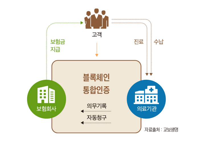 국내 금융기관의 블록체인 도입 사례를 살펴보면, 보험업 분야에서 교보생명이 블록체인을 보험금 지급 시스템에 활용하고 있다. 교보생명의 ‘스마트 보험금 자동청구 서비스’는 고객이 병원비용을 지불하고 나서 별도의 보험금 청구 절차 없이 보험사가