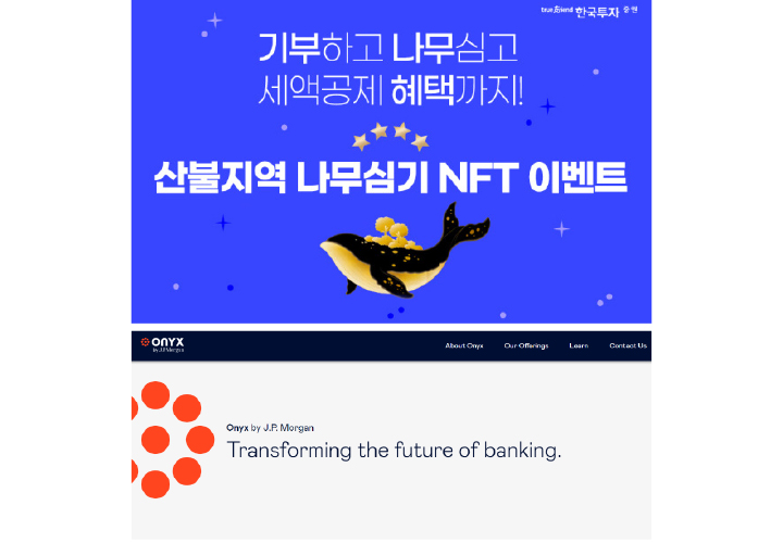 자동으로 보험금을 청구하고 지급하는 서비스이다. 블록체인 기반 통합 인증 기술을 활용하여 모든 과정을 비대면으로 자동 처리하고 기록 및 관리한다. 보험금 청구서류 발급과 신청서 제출을 고객 중심으로 분산처리하여 업무를 편리하고 신속하게 처리한다. 또한 스마트 컨트랙트를 통해 비대면 업무처리를 가속화하여 보험 프로세스의 자동화를 더욱 안전하게 촉진한다. 보험상품의 설계부터 보험금 지급까지 업무 전반에 걸친 프로세스에 블록체인 기술을 적용함으로써 프로세스 혁신의 효과성 향상과 고객 만족도를 획기적으로 높일 수 있다. 마케팅 업무에도 블록체인 NFT가 도입되고 있다. 현대카드는 NFT(Non Fungible Token)를 활용하여 문화마케팅을 활성화하고 있다. 2022년 3월 현대카드와 멋쟁이사자의 합작법인인 모던라이언을 통해 마켓 플레이스를 구축하고 현대카드 페스티벌 예약권을 단독 판매하는 등 자신들의 공연에 NFT를 접목하는 마케팅을 적극 진행하고 있다. 한국투자증권은 2022년 12월 동해안 산불지역 나무심기를 후원하는 ‘한그루투나무 NFT 이벤트’를 통해 산림 생태계 복원을 위한 블록체인 기부금을 모금하였다. 기부 이벤트에 참여한 고객들에게는 탄소중립 실천 기념 NFT를 증정한다. 2023년 5월 튀르키에와 시리아의 지진 피해자들을 위한 ‘긴급구호 대체불가토큰(NFT) 캠페인’을 진행하였으며, 기부 인증 NFT를 캠페인 참가자에게 지급하였다.