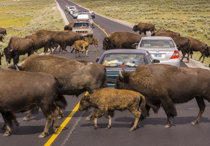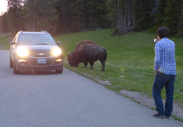 옐로우 스톤은 또한 야생동물과 인간이 평화롭게 조우하는 특별한 곳이기도 하다. 수많은 서식 동물들 중에서도 아메리카 들소인 바이슨과 사슴의 일종인 엘크 그리고 곰, 이들 세 종류가 옐로우 스톤을 대표한다. 누군가 멀리서 곰 한 마리라도 발견할라치면 소리를 지르고 일대엔 난리가 난다. 주변에 있던 모두가 곰 쪽을 향해 길을 멈추고 카메라 셔터를 누르기 바쁘다. 워낙 멀어 자그마한 모습인데도 ‘나 드디어 곰 봤다!’ 하는 듯 모두가 즐겁고 흡족한 표정들이다. 들소인 바이슨은 워낙 자주 보여 시간이 갈수록 심드렁해진다. 여러 마리가 떼를 지어 도로를 막는 바람에 차량들이 정체되기 일쑤다. 덩치들이 워낙 거대해서 차나 사람들에게 달려들지나 않을까 겁도 나지만 대체로 양순한 편이다. 일상에선 쉽게 볼 수 없는 야생동물들을 만나는 것도 정겹지만, 그들을 대하는 인간들 모습이 더 정겹고 재미난 곳이 옐로우스톤이다.
