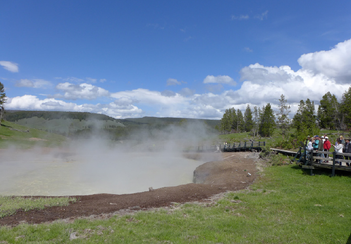 머드 볼케이노에서 옐로우 스톤의 상징인 간헐천과 들소(바이슨)들을 처음 만난다. 크고 작은 간헐천들을 바라보며 보드워크를 1시간 정도 트레킹한다. 하이든 밸리의 광활한 경관을 감상하고 아티스트 포인트(Artist Point) 아래 계곡으로 내려가 한두 시간 트레킹을 즐긴다.