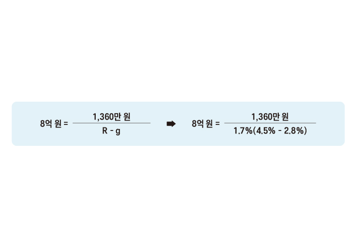 그렇다면 위의 숫자를 수식에 대입해보자. 분자 값은 1,720만 원, 자산가격은 8억 원이므로 분모 값은 1,360만 원 나누기 8억 원 하면 0.017라는 수치가 나오는데 퍼센트로 1.7% 즉, 아파트 요구수익률에서 성장률을 뺀 값이 현재 1.7%라는 말이 된다. 이 아파트의 월세는 은행이자보다는 현금흐름이 불안하기 때문에 예금의 요구수익률 3.5%보다는 높겠지만 그렇다고해도 서울 아파트의 월세가 매우 안정적임을 감안, 3.5%인 은행이자율보다 1% 정도 높은 4.5%라고 가정해보면 이 아파트의 분모 값이 현재 1.7%인 것은 투자자들이 이 아파트의 미래 성장률을 2.8%, 즉 1년에 평균 2.8% 정도는 올라갈 것이라고 판단해서 8억 원에 거래된다는 것이다. 그런데 계속해서 이어질 고금리에도 과연 서울 아파트가 앞으로도 줄곧 연간 2.8%씩 상승할 수 있을지는 의문이다.