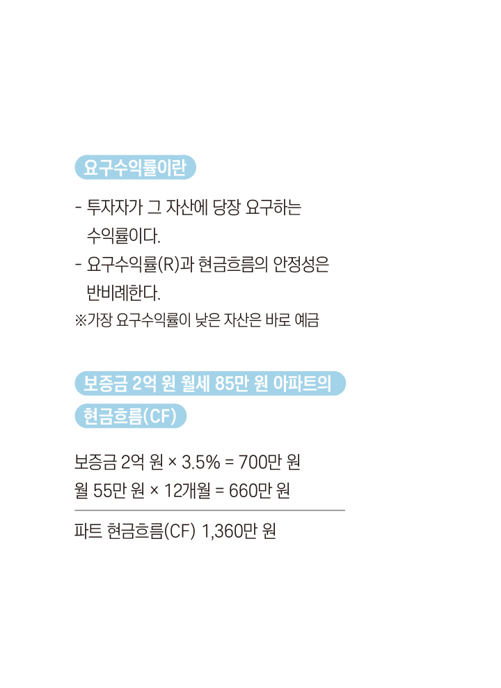 서울소재 전용 84㎡ 8억 원 아파트를 자산가격 결정원리로 이해해 보자. 우선 이 아파트의 현금흐름(CF)의 양을 확인해야 하는데 지난 6개월 간 이 아파트의 월세계약의 평균을 알아보니 보증금 2억 원에 월세 55만 원이었다면 보증금에는 예금이자율 평균 3.5%를 곱하고 월세금액에는 12개월을 곱해서 그 합을 구하면 된다.